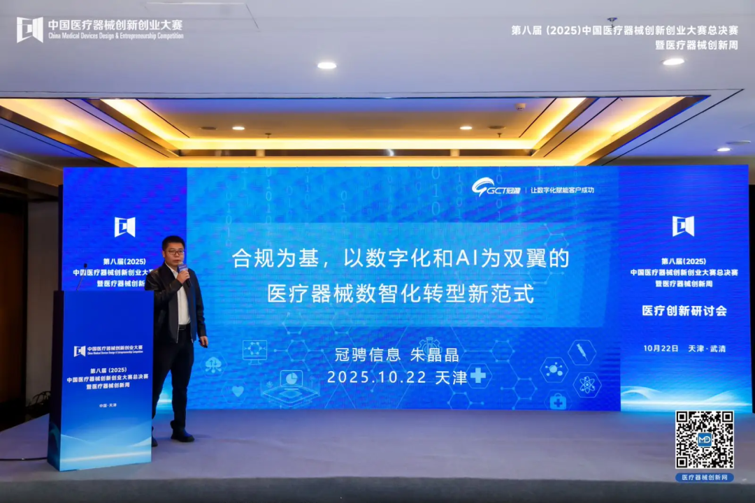 冠骋联合创始人兼副总经理朱晶晶其演讲涵盖医疗器械智能制造概况、冠骋信息及产品简介、数智化转型案例分享三大模块。他指出,2020 至今行业 “黄金十年” 中,医疗器械领域靠政策与创新双轮驱动实现万亿级突破,却面临传统模式成本高企、全球监管趋严的问题;当前行业机遇与挑战并存,以合规为基、“数字化 + AI” 为翼的数智化转型,是企业破局核心引擎。同时,他解读了冠骋聚焦医疗器械的数智化产品体系,并结合与南微医学、康诺思腾的合作实践,具象化呈现数智技术在降本增效、合规管控中的实际价值。
