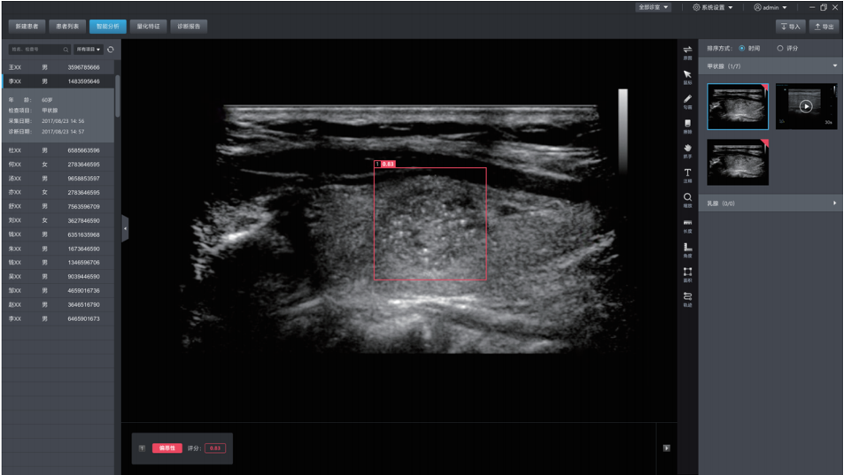 德尚韵兴医疗科技采用自主研发的深度学习框架DE-Light, 在专家标注的大量样本基础上,研发的超声辅助诊断系统,可自动探测超声图像中的病灶,并自动判断良恶性。甲状腺结节良恶性的准确率达到85%,达到三甲医院主治医生的水平。