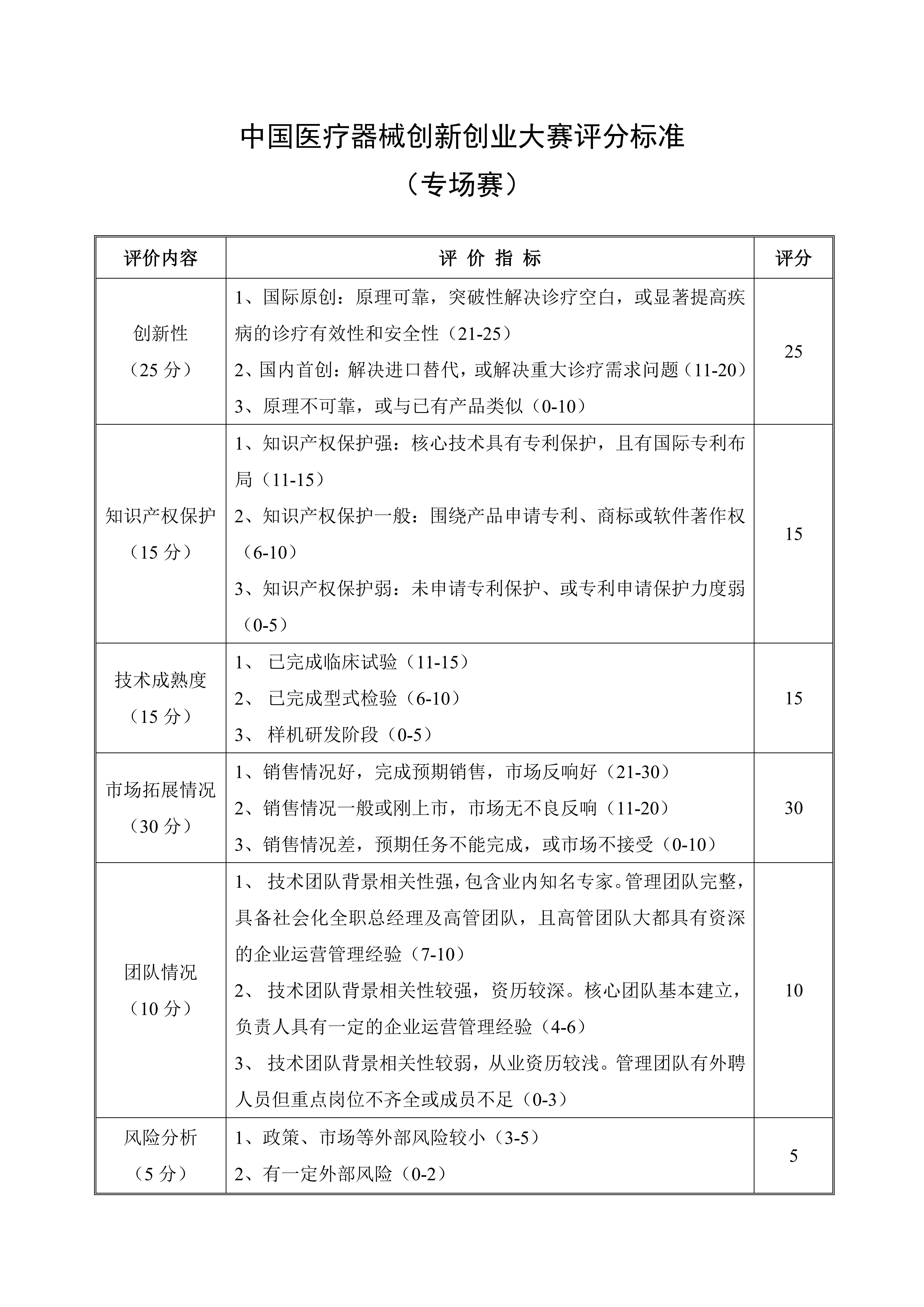 中国医疗器械创新网创业大赛评分标准(初创组)
